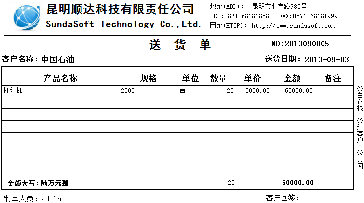 琦順達送貨單打印軟件具有數(shù)據(jù)自動記憶功能:您開過的送貨單不在需要重復(fù)錄入,您開過單的的客戶信息自動保留到客戶資料庫中,您給任何一個客戶的產(chǎn)品售價自動記錄并在當(dāng)次開單時自動提示、同一張送貨單,可打印為簡體,也可以打印為繁體等等,能夠做到了您所想不到的細致功能。送貨單號由系統(tǒng)自動生成(可按年+月+日+流水號等多種格式生成送貨單號),充分利用強大的數(shù)據(jù)庫功能給工作帶來的便利,真正的方便實用。系統(tǒng)內(nèi)置強大的權(quán)限管理功能,真真正正的讓您從此告別手工抄寫送貨單和使用EXCEL做月結(jié)的煩惱,打印出整齊漂亮的送貨單,同時還能即時管理商品庫存存貨和客戶欠款。